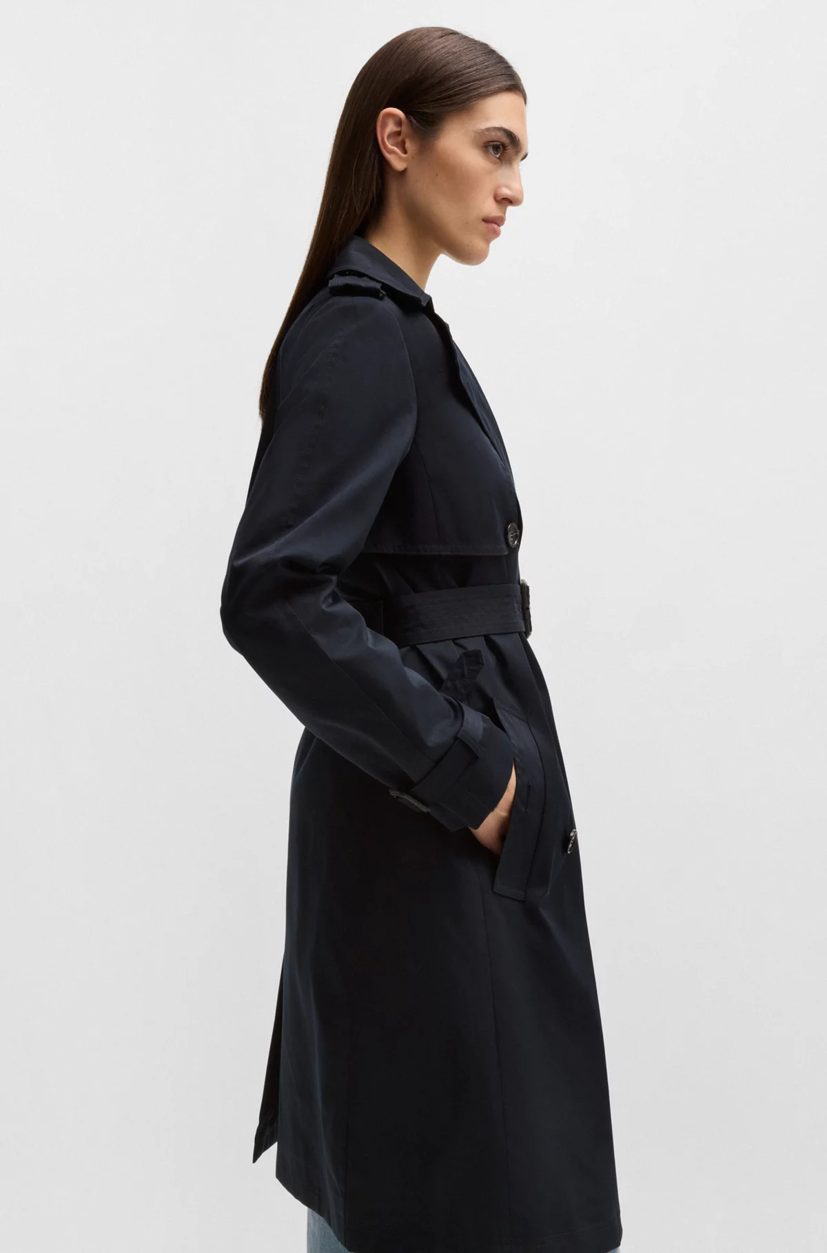 Καμπαρντίνα με διπλό στήθος από ελαστικό υλικό με φόδρα υπογραφή από την BOSS Womenswear. Αυτό το αυθεντικό κομμάτι ασφαλίζει με κουμπωτή ζώνη.