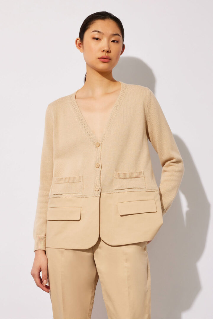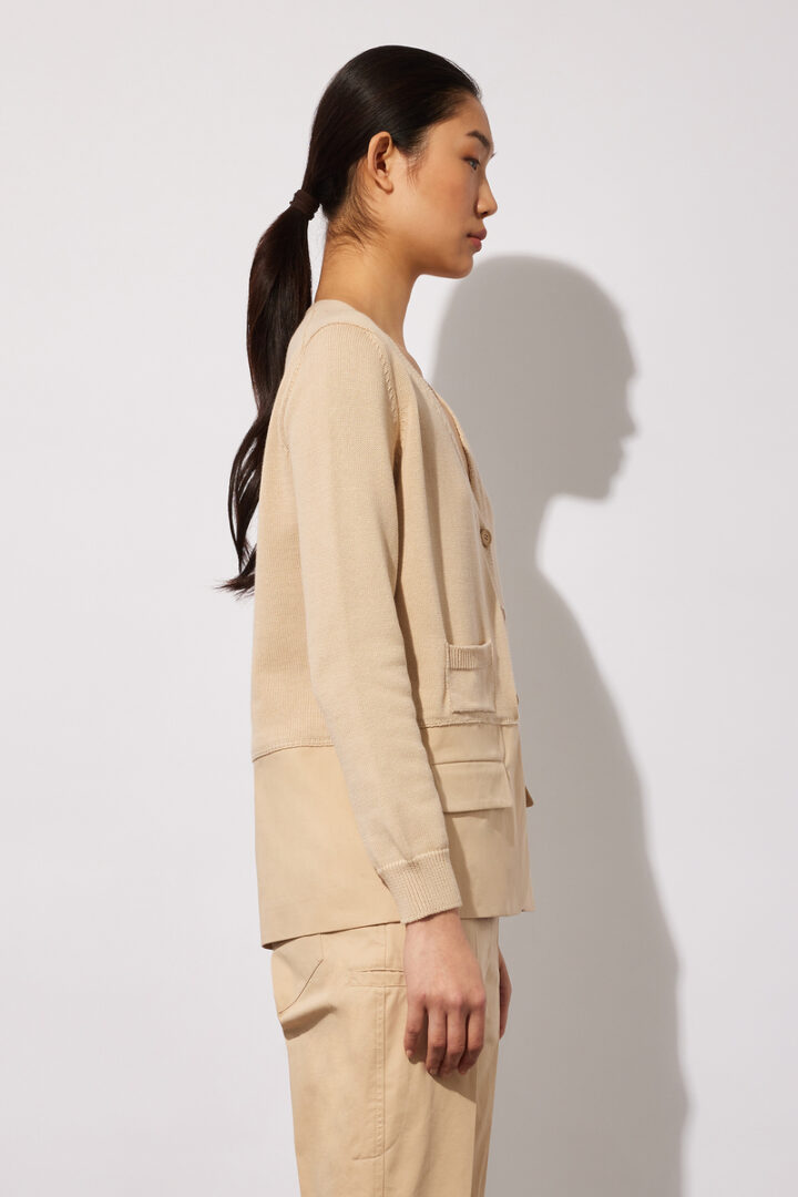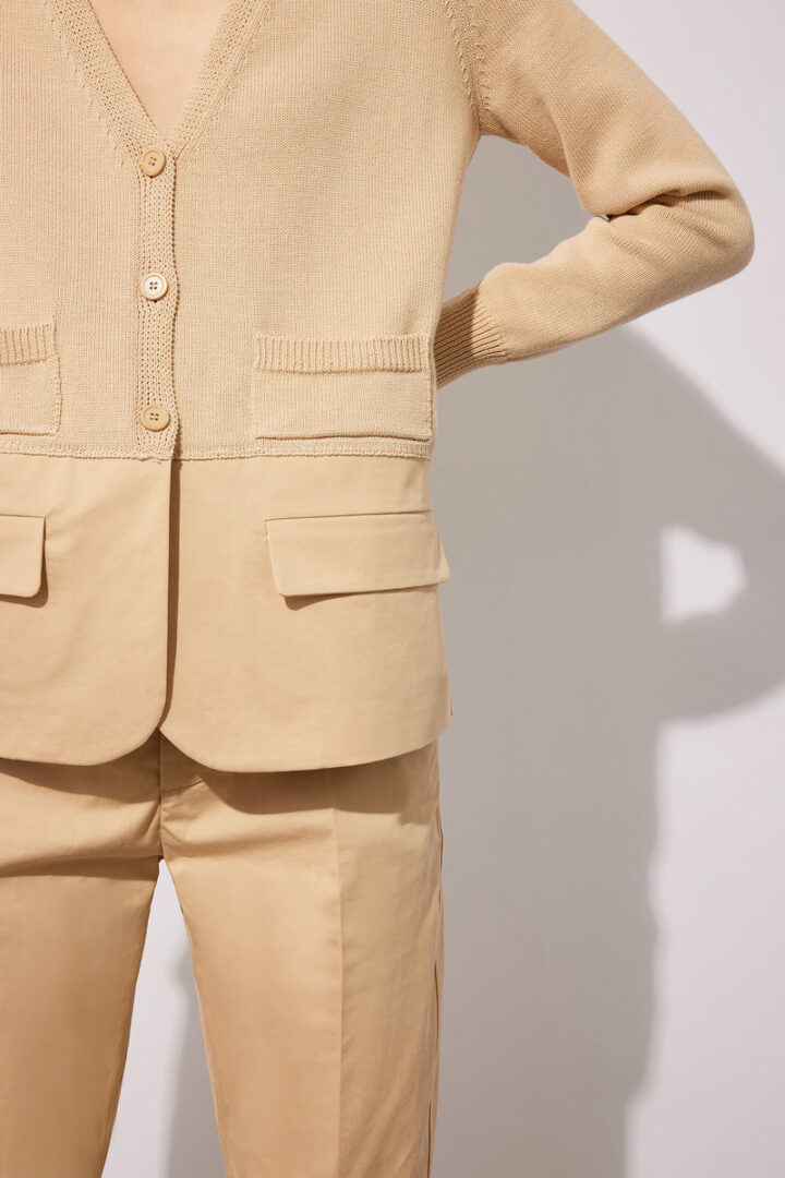 Μπουφάν με λαιμόκοψη από βαμβάκι και γκαμπαρντίνα, μακριά μανίκια. Τέσσερις patch τσέπες στο μπροστινό μέρος, που κλείνει με τρία κουμπιά τόνου σε τόνο. Κανονική εφαρμογή, μήκος ισχίου.
