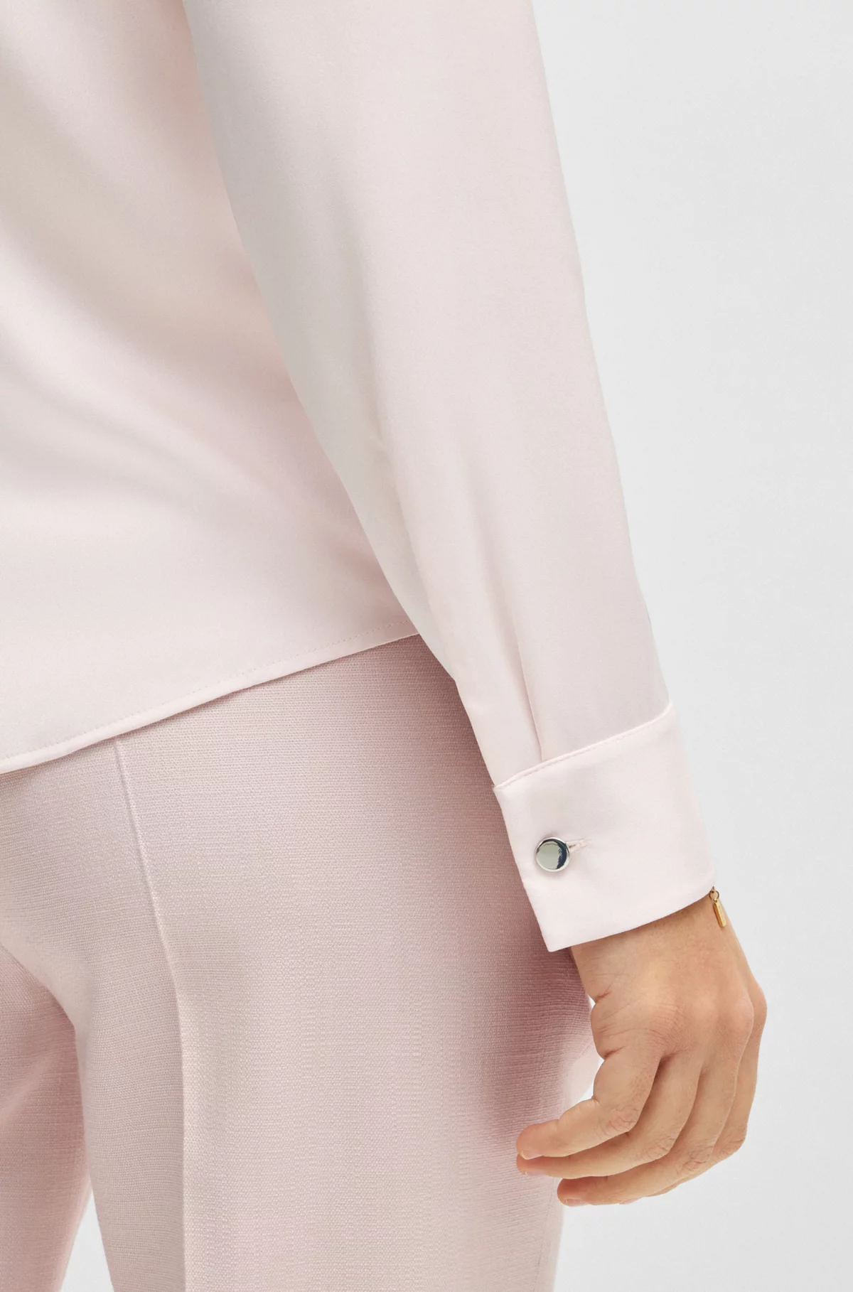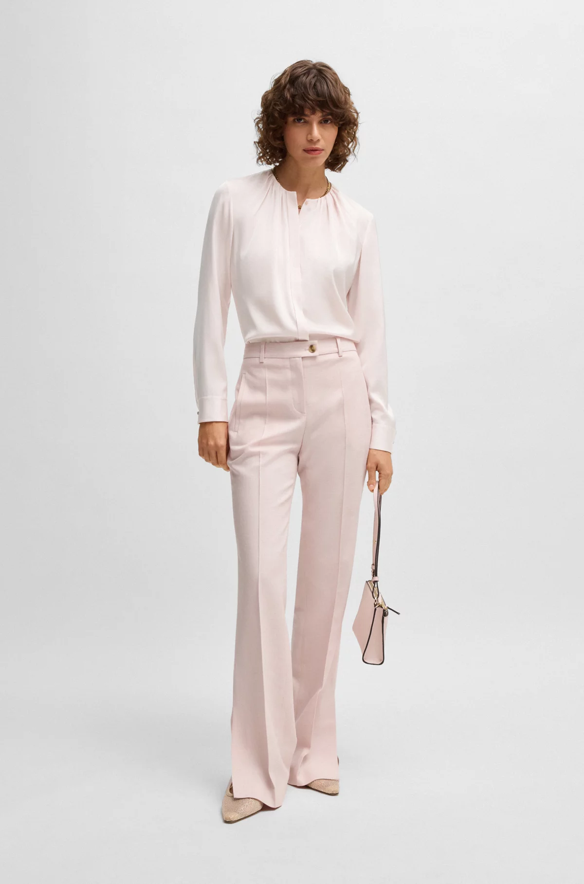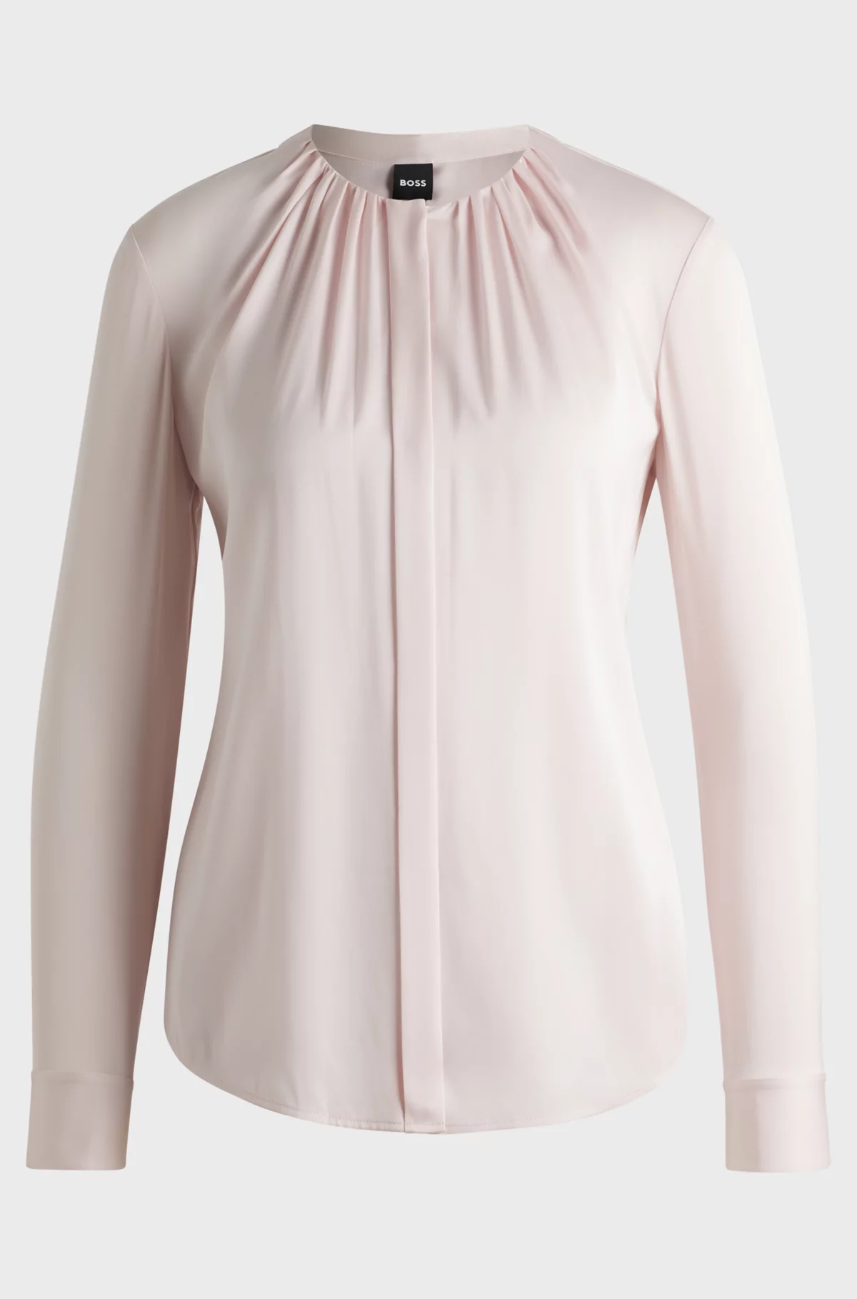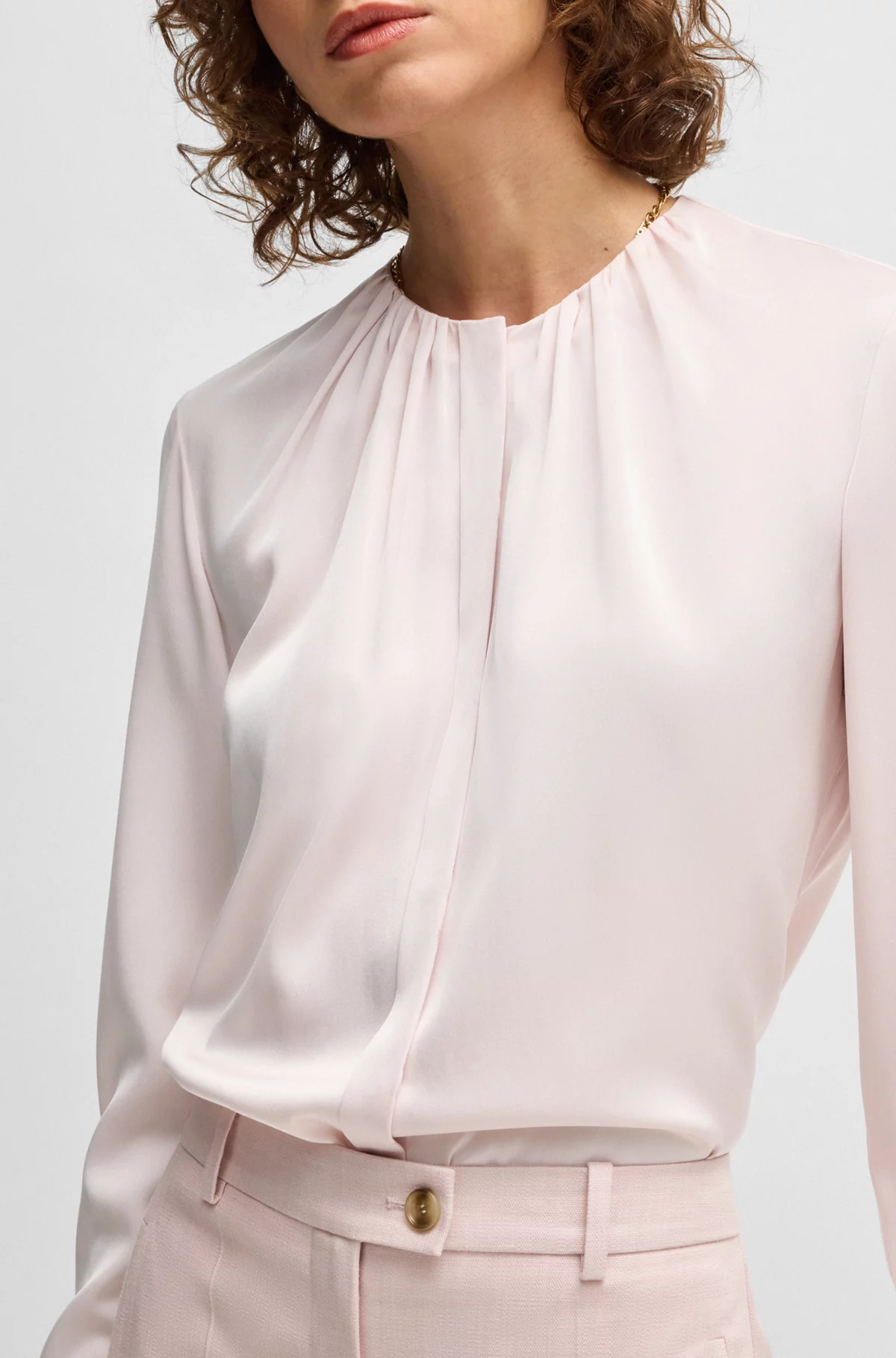 Μια γυναικεία μπλούζα φτιαγμένη σε ελαστικό μεταξωτό σατέν από την BOSS Womenswear. Αυτό το κομμάτι χωρίς γιακά είναι κομμένο σε κανονική εφαρμογή με συναρμολογήσεις στη λαιμόκοψη.