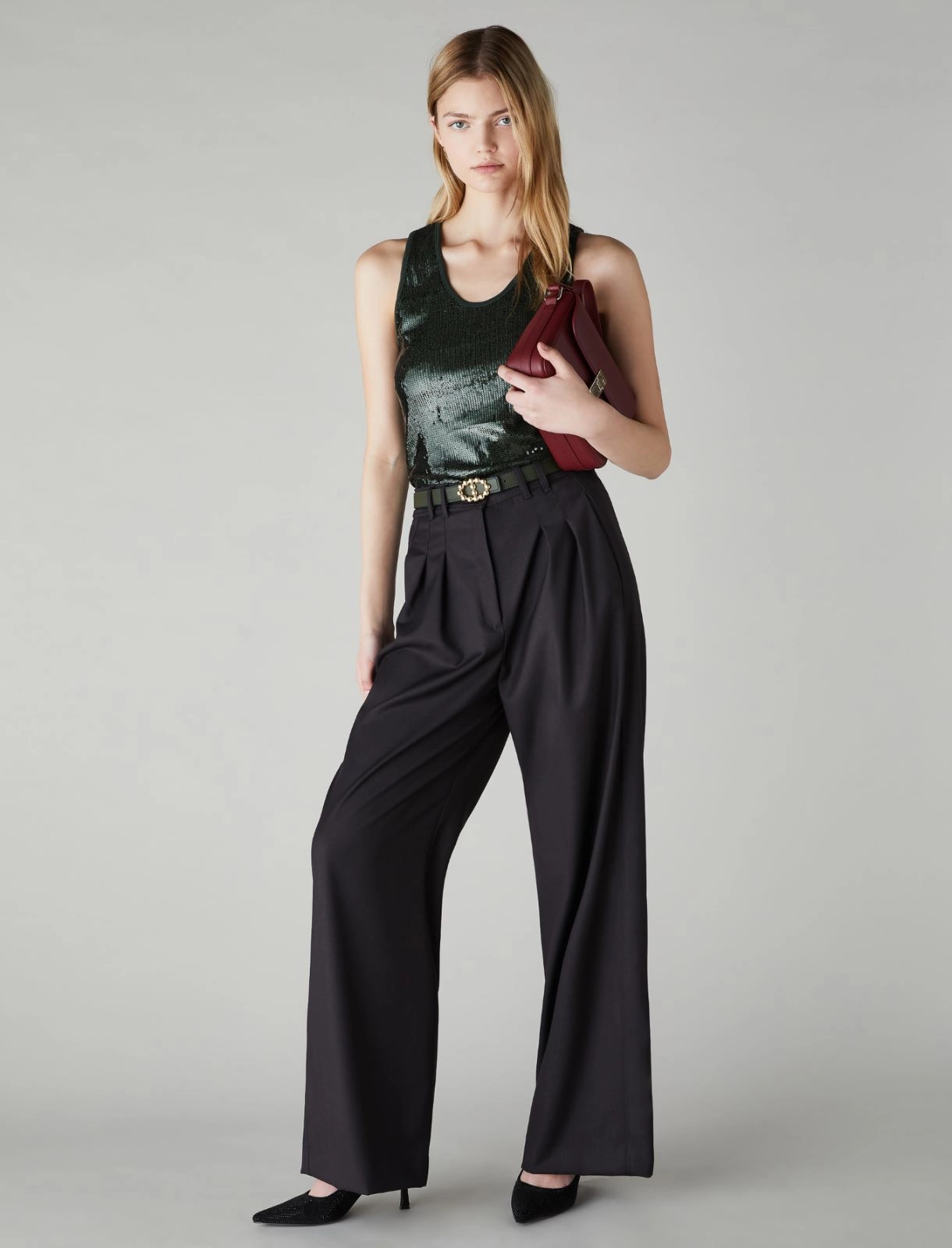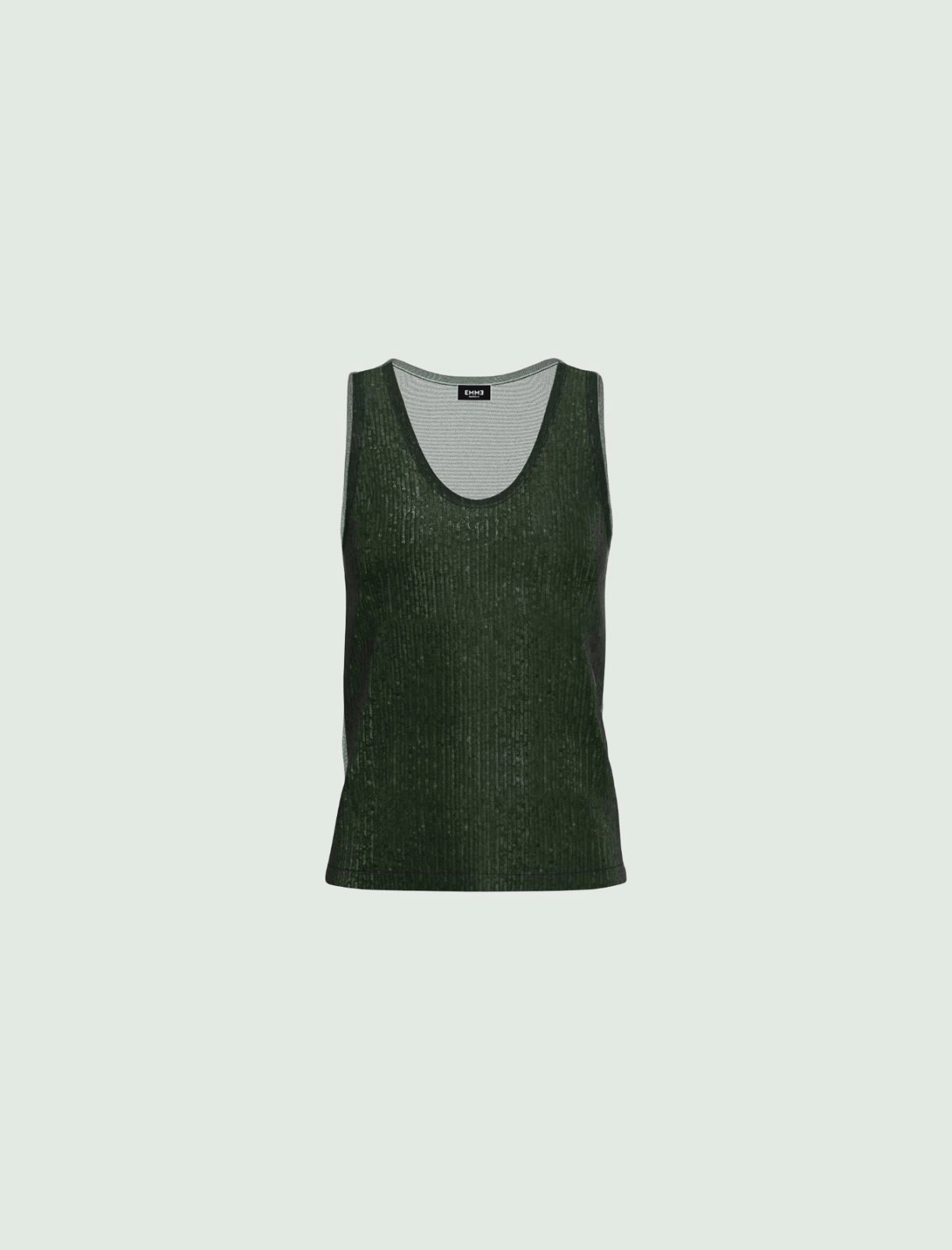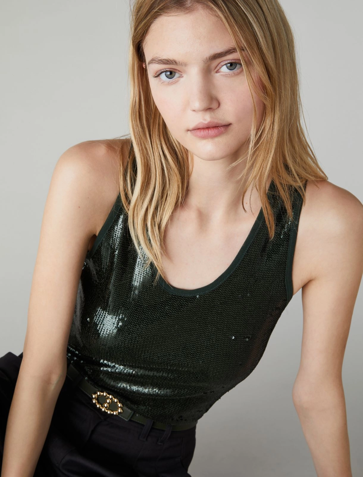 Αυτό το αμάνικο τοπ από τούλι διαθέτει λεπτομέρεια κεντημένη με παγιέτες στο μπροστινό μέρος. Ένα εμβληματικό κομμάτι που είναι το απόλυτο must-have της γκαρνταρόμπας.