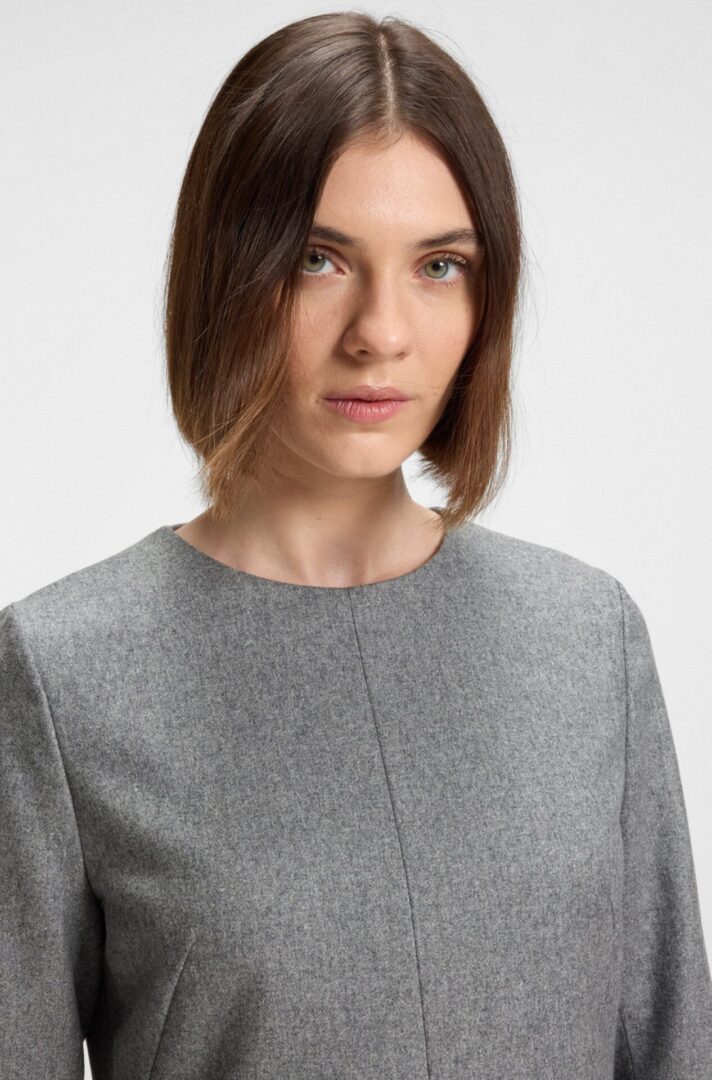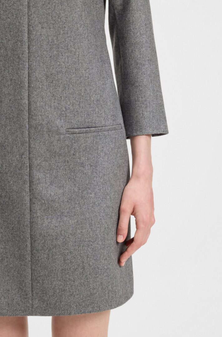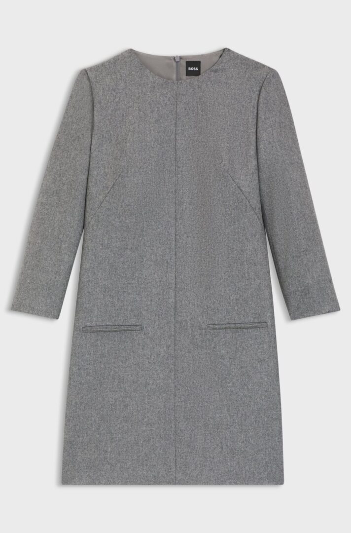 Δημιουργήστε αβίαστες επαγγελματικές εμφανίσεις με την απαλή φανέλα αυτού του γυναικείου φορέματος BOSS. Συνδυασμένο με μαλλί. Τσέπες με ρέλι και σχισμές στα μανίκια.